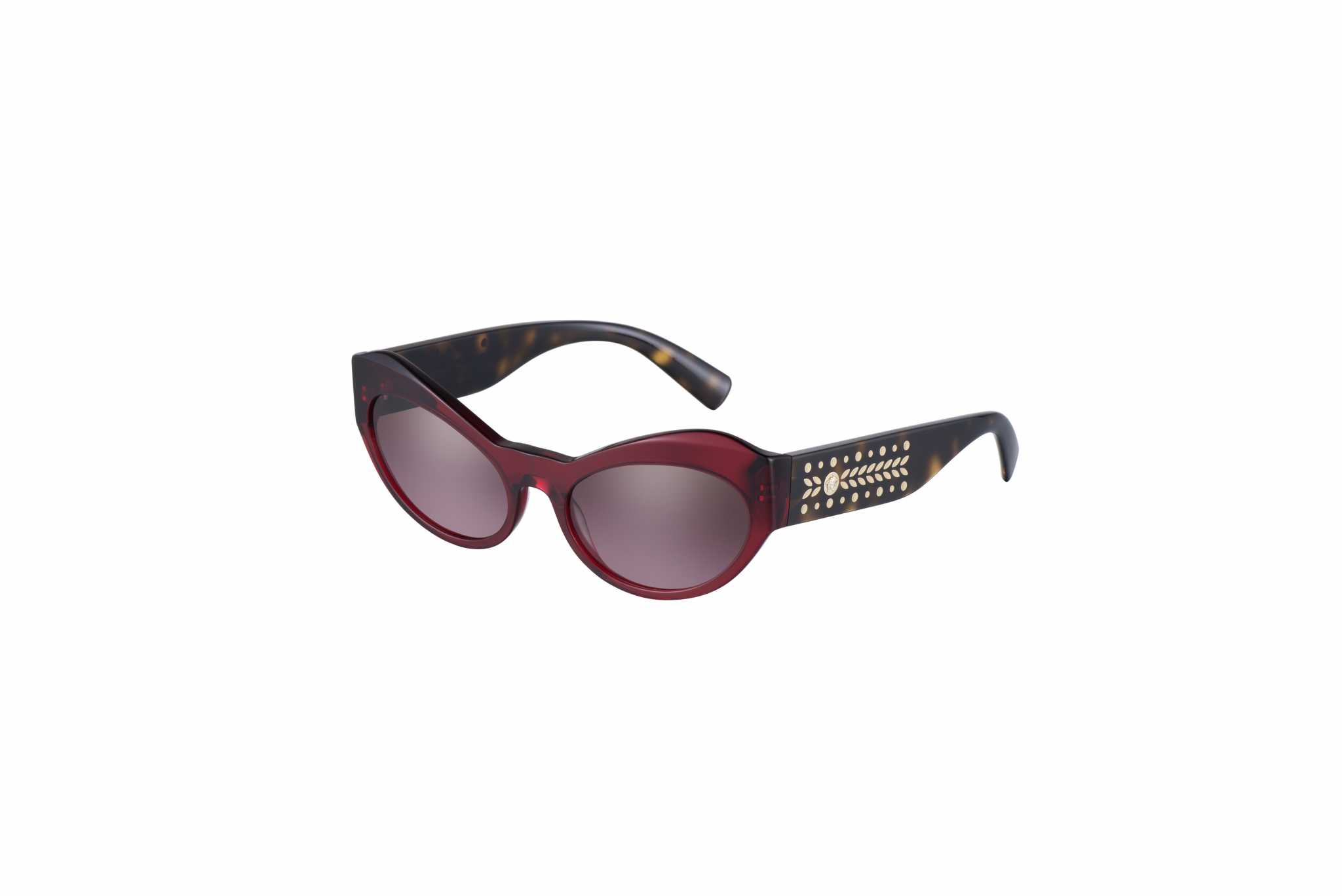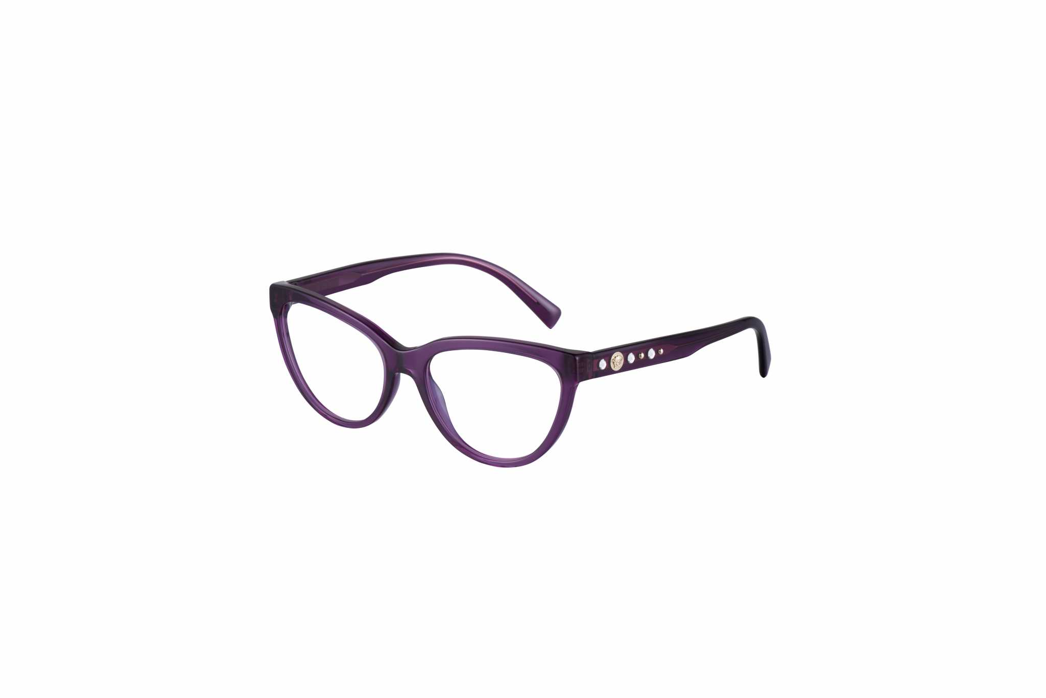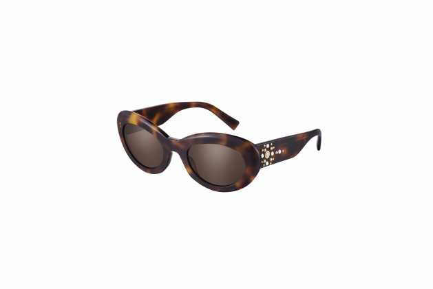 Il terzo modello, invece, è consiste in una scintillante montatura cat-eye in acetato che incarna alla perfezione l’estetica contemporanea. Le aste affusolate e i cristalli in tre colori conferiscono leggerezza e raffinatezza, mentre le due borchie e il medaglione Medusa in 3D sulle aste danno il tocco finale al look. Questo modello è disponibile in viola o marrone trasparente e in nero tinta unita.