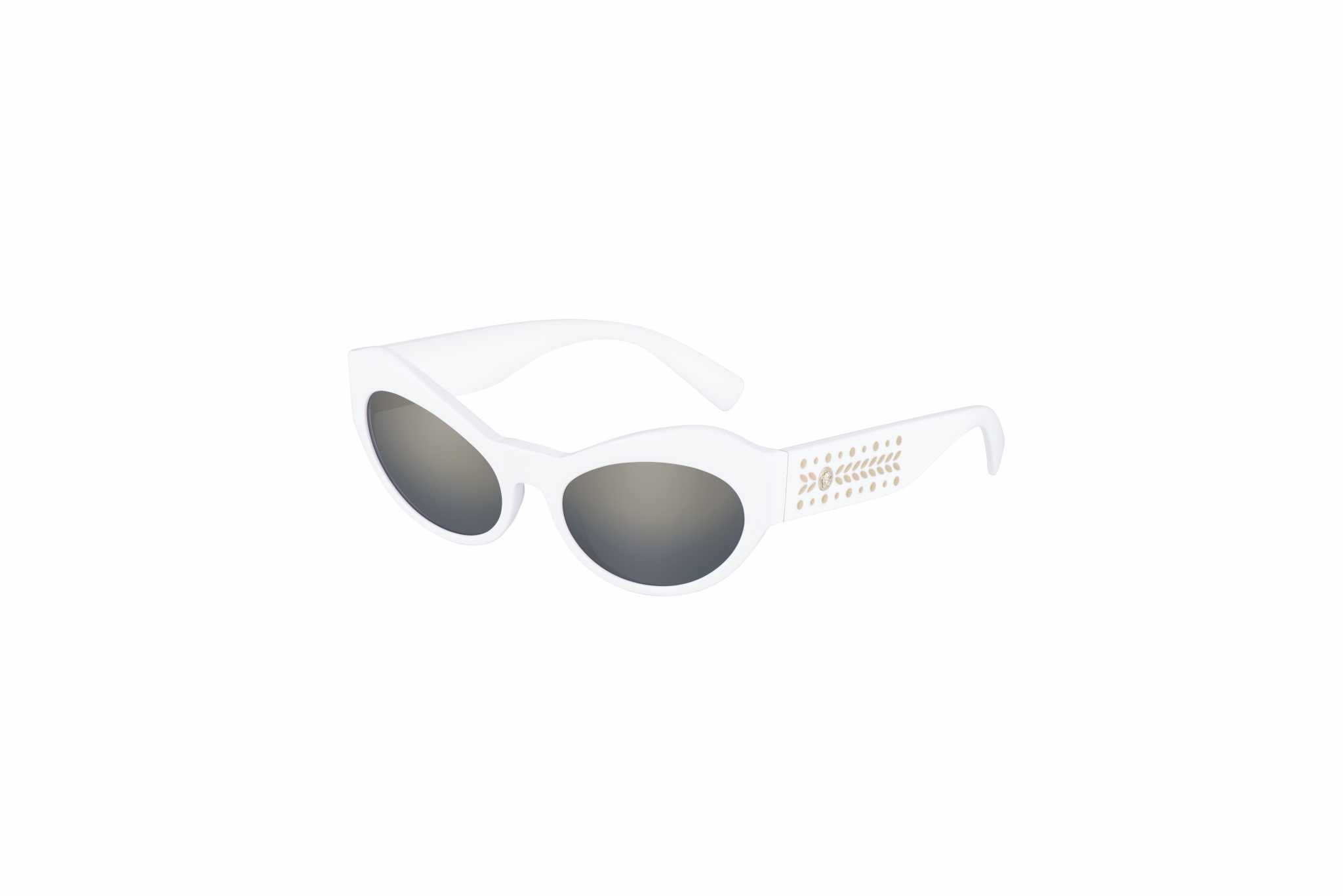 Tra i modelli da sole vi è il VE 4355B – Medusa Studs, femminile, con forma ovale ridotta, cerchi audaci e aste in acetato. I simboli del brand vengono rivisitati con tonalità cristallo glitterate, mentre i profili dal sapore retrò-chic evocano un fascino e un carisma senza tempo. Questo può essere arricchito da borchie e dalla Medusa in 3D impreziosita da cristalli colorati. La palette cromatica di questo modello Versace comprende proposte in havana e nero.