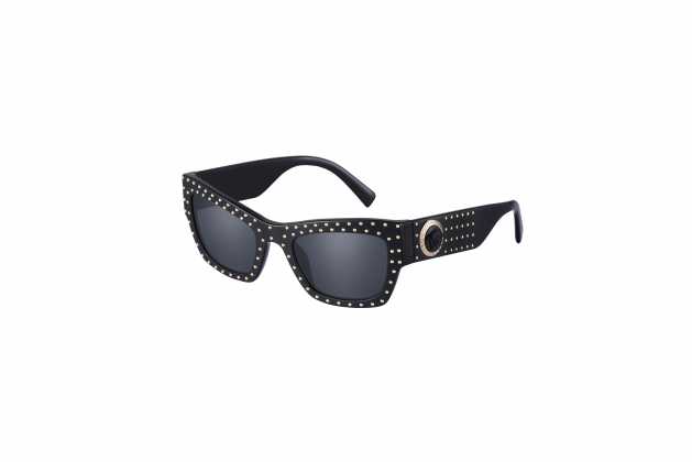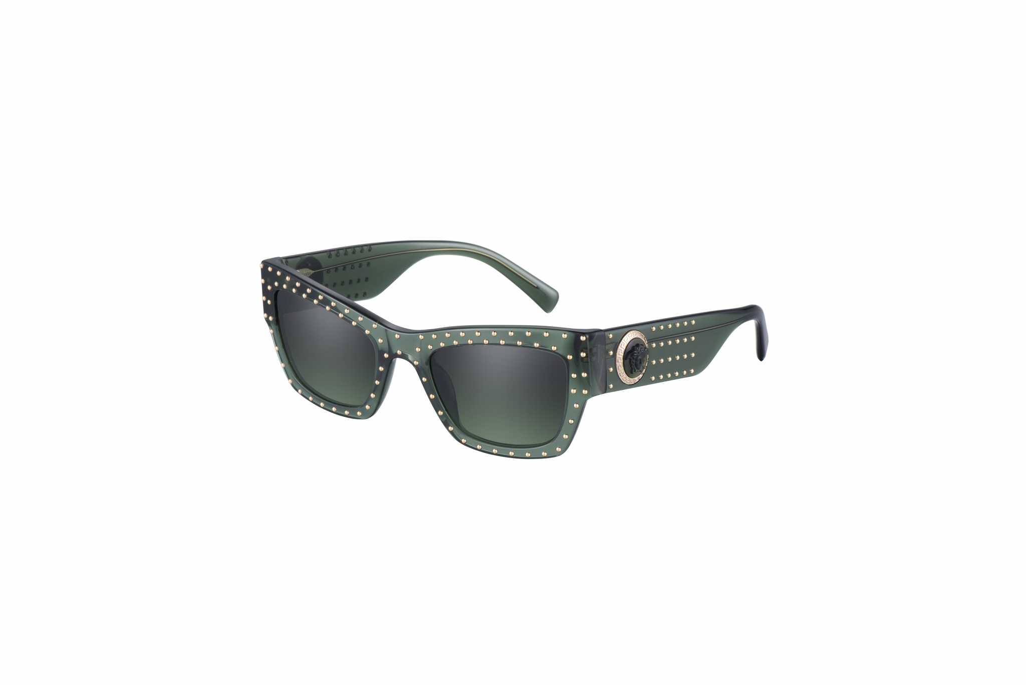 VE 4358 – Medusa Ares Stud è un modello da sole che si distingue per il carattere rock e allo stesso tempo glamour in chiave femminile, ispirata agli anni Ottanta. Sfidando i canoni della moda, i colori trasparenti e i classici profili scuri sono valorizzati dalle borchie dorate e dalla Medusa in rilievo sul medaglione dorato con motivo a chiave Greca inciso. La montatura in acetato con borchie dorate è caratterizzata da aste ampie che richiamano la collezione di accessori. Il modello è disponibile in bianco, nero e verde trasparente.