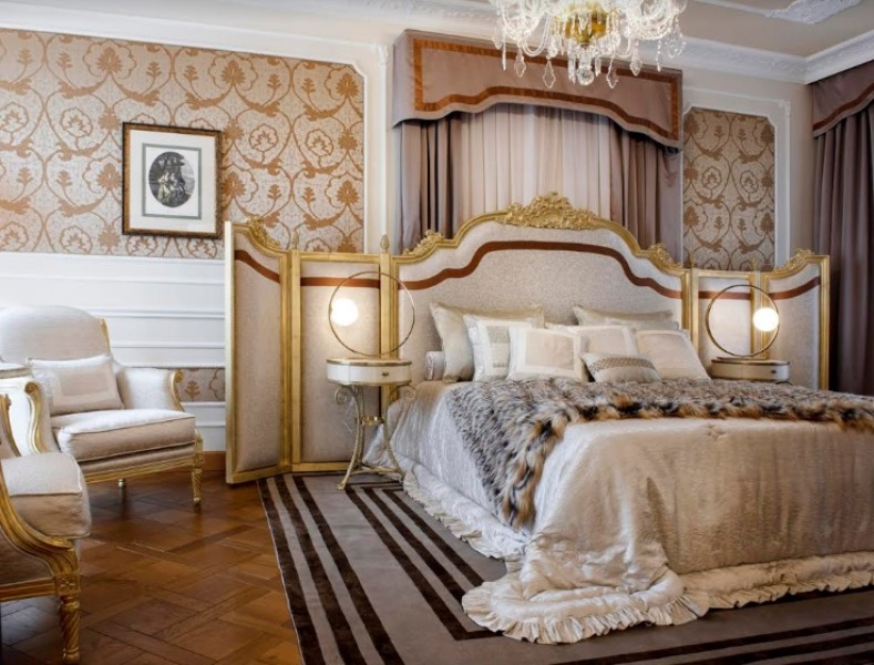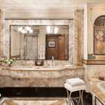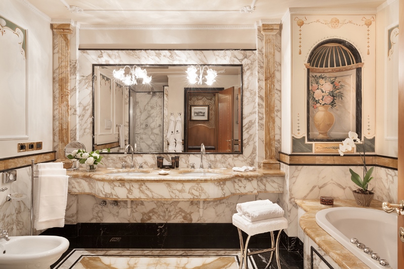 Nell’appartamento principale della Montenapoleone, la Top suite dell’hotel (foto della terrazza in apertura), la protagonista assoluta è la linea classica Jumbo Collection, capace di esprimere il concetto di lusso ai massimi livelli secondo un approccio inedito, più contemporaneo, fresco e luminoso. La delicata palette cromatica nei toni del beige e del verde oliva, impreziosita da tocchi dorati, regala un’ambientazione raffinata, nella quale si susseguono pezzi caratterizzati da marmi pregiati come l’onice nuvolato e cristallo, la cui lavorazione mostra tutta l’abilità artigianale che da sempre si ritrova negli arredi del brand. Un progetto di interior design trasversale, in cui ispirazioni orientali e francesi si uniscono in un mix eclettico che racconta una nuova dimensione dello stile classico.