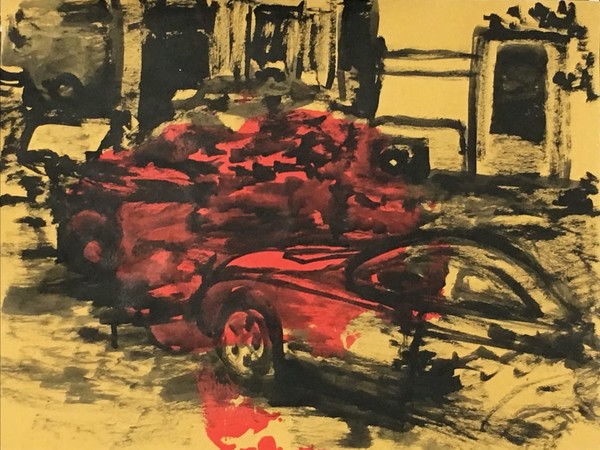 In mostra grandi carte trattate a olio, smalto e acrilico, oltre a lavori che Rotondi realizza, tradizionalmente, su carta paglia, la “carta gialla” utilizzata a Livorno per uso quotidiano in casa e al mercato. Per la prima volta l’artista si misura con la realizzazione di un video, formato da immagini amatoriali e da una animazione, dove il rumore della pioggia è l’elemento costante.