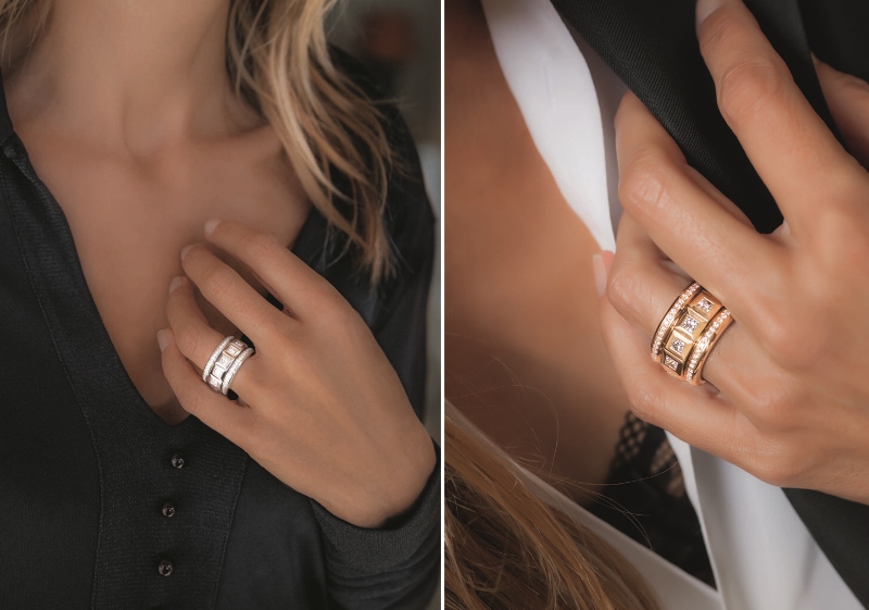 Preziosi ed eleganti, i diamanti bianchi o champagne e gli zaffiri taglio princess illuminano il gioiello, forgiato con oro bianco, oro giallo e oro rosa. Le differenti dimensioni dell’anello accolgono una sequenza da 12 a 15 pietre nella variante più grande, ordinate in successione lungo un elemento mobile al centro. La versione più preziosa con diamanti taglio princess propone una declinazione con pavè di diamanti quale splendida cornice che ruota attorno al dito in uno scintillante girotondo.