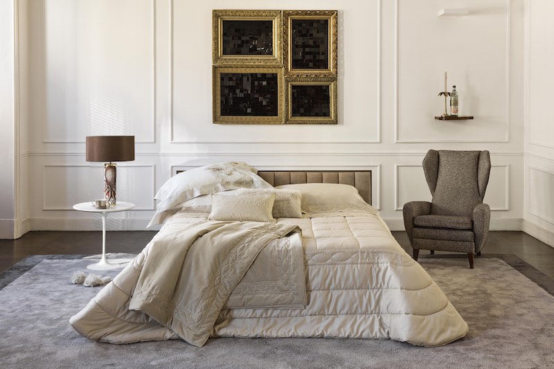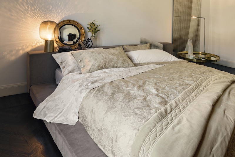 Completi lenzuola, completi copripiumino, quilt, cuscini, copriletti e morbide proposte per il bagno suggeriscono un luxury lifestyle che si declina in due gamme di abbinamenti cromatici. Da un lato, la camera da letto si tinge dei toni neutri con il bianco seta, il torrone e il gesso; dall’altro, ritrova vigore nelle sfumature calde e avvolgenti, dai rosa ai terracotta, così come in quelle delicatamente fredde, dal verde menta al celadon. L’oro, scelto nei dettagli, diventa l’elemento di preziosità.
