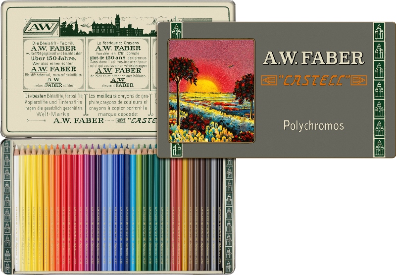 Concepite per gli artisti, le matite Polychromos sono un vero classico e ancora oggi uno dei prodotti più apprezzati al mondo. Sono riconosciute per la qualità ineguagliabile, la straordinaria energia dei colori e sono famose anche per la loro caratteristica estetica: presentano una sezione circolare e sono realizzate con legno di cedro, lucide, sono disponibili in una vasta gamma di colori, dal bianco opaco al blu montagna, dal rosso saturno al marrone Van Dyck. La palette è cresciuta da 60 tonalità fino ad arrivare, oggi, a 120 colori.