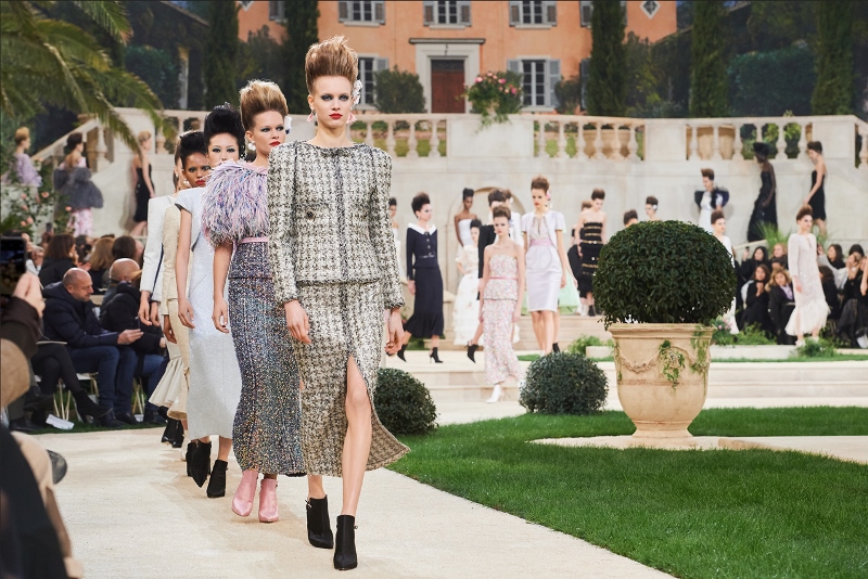 In questa stagione, il Grand Palais di Parigi diventa il vasto giardino mediterraneo di una bella e grande casa. Una pozza d’acqua è circondata da alberi e specie vegetali meridionali in un’armonia di linee pulite. I percorsi sono quasi “alla francese”, come i giardini del XVIII secolo. In effetti, è questo periodo, il suo preferito, che ha ispirato Karl Lagerfeld, e in particolare i talenti dei marchands-mercierse il savoir-faire degli artigiani del lusso francese.