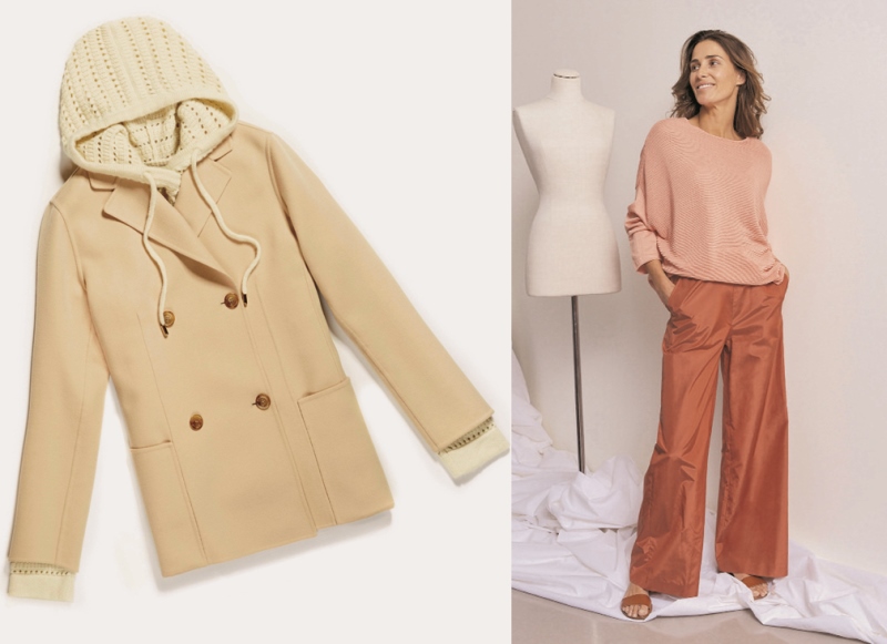 Protagonista della collezione è il peacoat in cashmere double. Le linee semplici evidenziano la preziosità del cashmere; i toni pastello ne enfatizzano la femminilità. La maglia traforata, con cappuccio, dal carattere sportivo, è in Kid Cashmere, il filato extrafine ottenuto dalla prima, delicata pettinatura delle caprette cashmere. La costante ricerca dell’eccellenza del Lanificio Colombo ha permesso, attraverso l’innovazione tecnologica, di valorizzare le proprietà intrinseche delle fibre nobili rendendole sempre più moderne, sofisticate e facili da indossare.