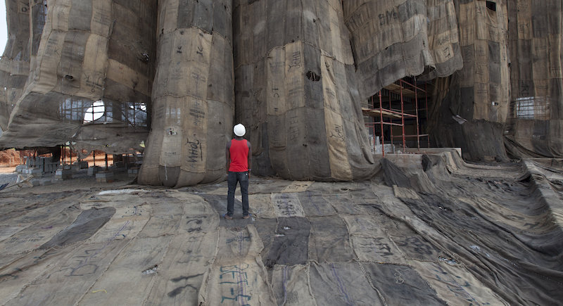 I sacchi di Mahama racchiudono allo stesso tempo un significato più nascosto che riguarda la forza lavoro che si cela dietro la circolazione internazionale delle merci. Il sacco di juta, spiega l’artista, “racconta delle mani che l’hanno sollevato, come dei prodotti che ha portato con sé, tra porti, magazzini, mercati e città. Le condizioni delle persone vi restano imprigionate. E lo stesso accade ai luoghi che attraversa”. Per assemblare i sacchi, spesso Mahama collabora con decine di migranti provenienti da zone urbane e rurali in cerca di lavoro, senza documenti né diritti, vittime di un’esistenza nomade e incerta che ricorda le condizioni subite dagli oggetti utilizzati nelle proprie opere.