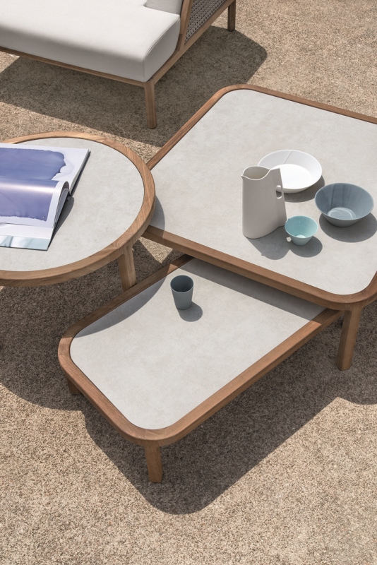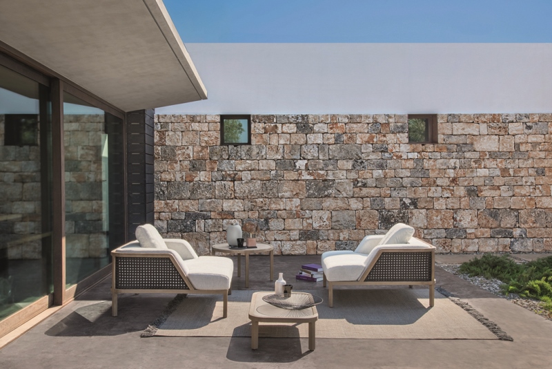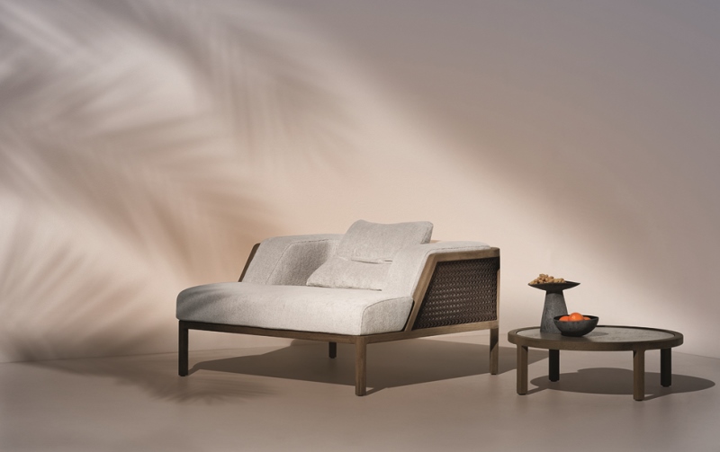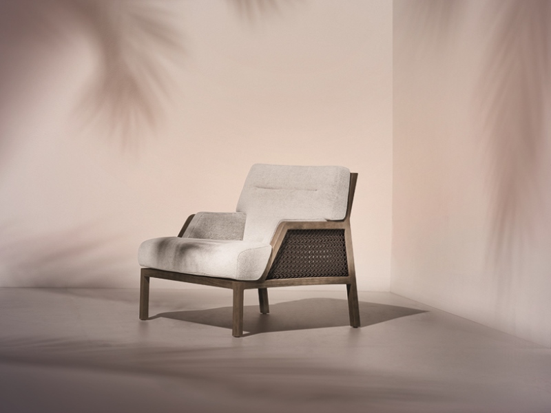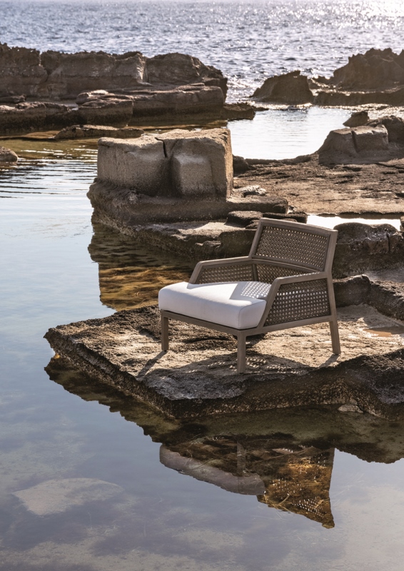 La gamma propone divani e poltrone lounge dalle ampie proporzioni, dall’architettura decisa, pura ed essenziale, con finiture dai dettagli curati e delicati; arredi che rivelano uno spirito sartoriale e rappresentano una nuova filosofia del vivere en plein air. Il calore e l’eleganza del teak e la leggerezza della fibra si uniscono per creare arredi dall’ergonomia straordinariamente accogliente, espressione di un lifestyle più rilassato e di una sofisticata quotidianità. La struttura degli arredi è realizzata in teak con anima in metallo, mentre lo schienale delle diverse tipologie di seduta, nasce dal sapiente e raffinato intreccio della corda acrilica. Soffici cuscini dalle forme generose, realizzati con tessuti morbidi al tatto e specifici per l’uso esterno, ne aumentano il senso di comfort e di benessere. Una collezione per una ‘Grand Life’ en plein air capace di trasmettere sensazioni tattili e visive caratteristiche delle più eleganti situazioni indoor.