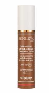 Sunleÿa G.E SPF 50+ aiuta a preservare la giovinezza della pelle esposta al sole nella continuità di un trattamento anti-âge quotidiano, contrasta i due fattori primari dell’invecchiamento cutaneo come la Glicazione (irrigidisce le fibre di collagene portando alla perdita di compattezza della pelle) ed Elastosi Solare (contribuisce alla comparsa di rughe profonde). La Glicazione viene contrastata dall’Estratto di Piccolo Farro, esperto anti-âge di Sisley e ricco del peptide mimetico Glutatione preservandone la compattezza epidermica, mentre l’Estratto di Aneto protegge la funzionalità delle fibre di Elastina prevenendo la formazione di questo tipo di rughe. A questi 2 attivi principali, si aggiunge un complesso anti-âge particolarmente sofisticato (estratto Peptidico di Soia, foglie di Salice Bianco e Piccolo Farro) in grado di agire contro i radicali liberi, collagenasi ed elastasi. Questo complesso preserva l’integrità del DNA cellulare e stimola la sintesi del collagene.