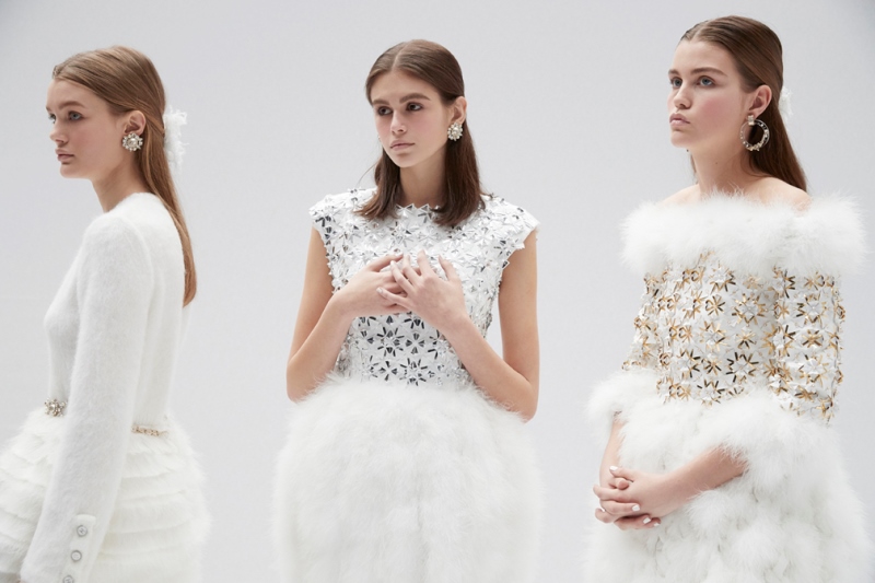 Il romanticismo abbonda con i grandi mantelli di lana, gli abiti con colletti di Claudine e le file di pannelli arrotondati, le gonne in pizzo guipure nevoso e gli smoking bianchi in raso duchessa. Infine, le gonne “snow-ball” e gli abiti in chiffon e piume con il busto ricamato con fiocchi di neve in vinile bianco e oro, distillano la modernità, la giovinezza e il pizzico di umorismo che caratterizzano la donna Chanel.