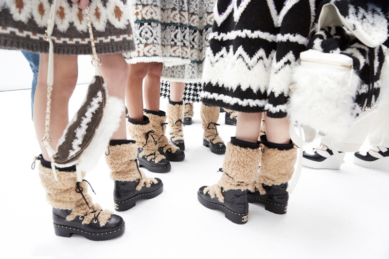 Le giacche di tweed sono rifinite con una treccia di lana spessa, tessuta o lasciata quasi grezza. I grandi pullover in maglia morbida si alternano a maglioni ricamati con cristalli e cardigan con motivi montani. Gli abiti da sci si mischiano a quelli urbani: un piumino è sfoggiato con pantaloni a taglio largo in tweed big check, mentre una tuta da sci zip-up è in tweed tricolore. Intrecciati o abbelliti da una tasca applicata per scivolare in uno skipass, piccole giacche di tweed sono abbinate a una gonna a matita e un completo di giacca e pantaloni ampi in pelle.