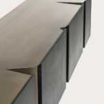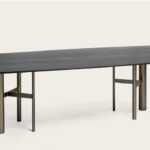 Disponibile anche in versione tonda, è realizzato con una struttura in metallo color bronzo chiaro valorizzata da un piano in legno nero.