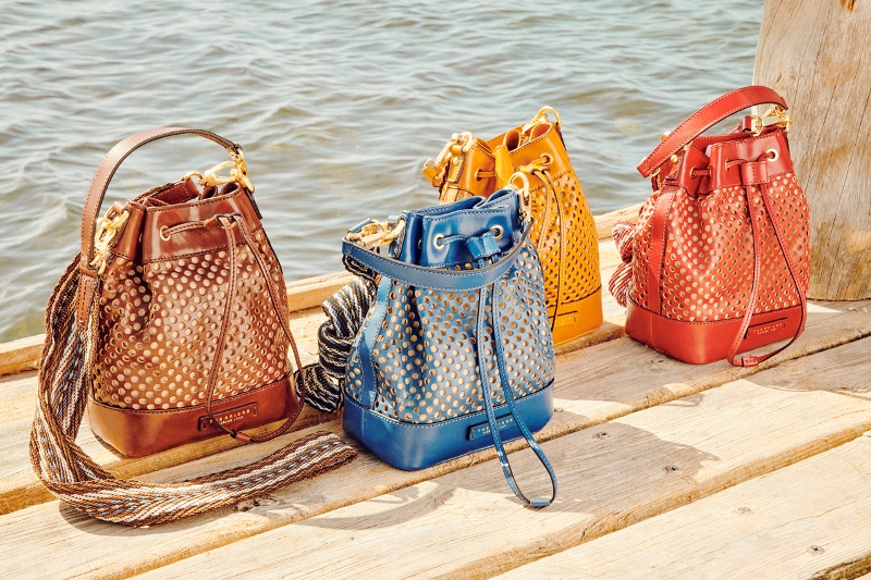 La nuova generazione di mini secchielli della collezione SS19 di The Bridge, s’ispira ai modelli d’archivio degli anni ’70. Simbolo di quegli anni, il secchiello è diventato un accessorio cult anche negli anni ’80. Oggi più morbido nelle forme e nella silhouette, è tornato ad essere un accessorio di moda, proposto da tante maison. Protagonista delle passerelle è arricchito da nappine e frange mentre a volte presenta linee molto pulite e semplici con una chiusura a coulisse. Il motivo traforato aggiunge un sapore sporty-chic alla collezione e la doppia tracolla (una è in filo di nylon colorato) unita al manico per portarlo a mano o a braccio, ne sfruttano la doppia funzione. In quattro divertenti e giovani nuance: il classico marrone, giallo, rosso e azzurro.