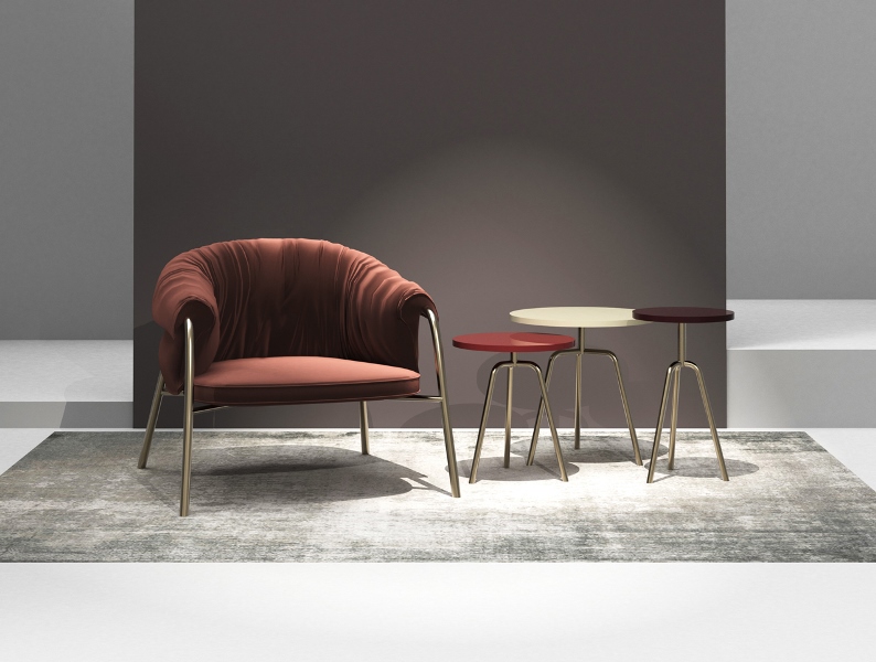Le forme morbide e avvolgenti della poltrona lounge, con struttura in acciaio e imbottitura rivestita con pregiati tessuti, assicurano comfort, benessere e una perfetta ergonomia, mentre i tavolini, con struttura in acciaio, superfici trattate in diverse varianti e piani in legno laccato di differenti finiture, garantiscono una solidità ideale. Insieme, dialogano per creare composizioni inedite ed eleganti per arredare, con funzionale eleganza, sia gli ambienti residenziali sia gli spazi contract.