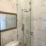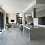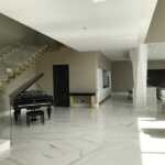 Il salone di rappresentanza veste a pavimento la lussuosa collezione Roma Statuario Lux nel formato 75×150 cm che riproduce con estremo realismo le peculiarità cromatiche del marmo e dona alla zona living un carattere esclusivo. In cucina, nella nicchia ricavata per la zona lavaggio e il piano di lavoro, spicca l’inserto Maku Trace Dark a parete nel formato 40×60 cm, in contrasto con la scelta cromatica chiara degli arredi e del pavimento. Anche nei bagni padronali e degli ospiti, i rivestimenti hanno un ruolo da protagonisti:Roma Calacatta è la collezione scelta per il bagno degli ospiti al primo piano con i formati 25×75 cm e Micromosaico a parete, mentre a pavimento prosegue la stessa Roma Calacatta con tessere in versione Macromosaico.