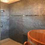 Incontro di stili e materiali differenti nella stanza da bagno al secondo piano con pavimento ricoperto dalla serie Firenze nei colori Nero, Bianco e Grigio – formato 25×21,5 cm. Nella zona doccia si distingue Boston Round Mosaico Blu Petrolio, mentre a parete è stata utilizzata Boston Petrolio 7,5×30 cm insieme alla brillante collezione Lumina White Gloss e struttura Diamante – formato 50×110 cm – impreziosita dal listello Satinato Silver. Per il benessere degli ospiti, uno dei sofisticati ambienti della villa ospita l’accogliente bagno turco con pavimento realizzato in Macromosaico 30×30 cm della collezione Terra, colore Malta. La parete veste, invece, la raffinata serie Roma Grafite che riproduce fedelmente la pietra naturale ed è decorata dal prezioso listello Raku. Romantica è la tinozza in legno che completa la zona wellness.