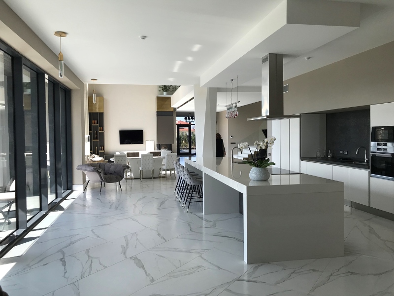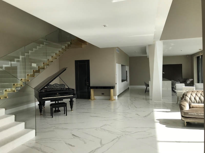 Il salone di rappresentanza veste a pavimento la lussuosa collezione Roma Statuario Lux nel formato 75×150 cm che riproduce con estremo realismo le peculiarità cromatiche del marmo e dona alla zona living un carattere esclusivo. In cucina, nella nicchia ricavata per la zona lavaggio e il piano di lavoro, spicca l’inserto Maku Trace Dark a parete nel formato 40×60 cm, in contrasto con la scelta cromatica chiara degli arredi e del pavimento. Anche nei bagni padronali e degli ospiti, i rivestimenti hanno un ruolo da protagonisti:Roma Calacatta è la collezione scelta per il bagno degli ospiti al primo piano con i formati 25×75 cm e Micromosaico a parete, mentre a pavimento prosegue la stessa Roma Calacatta con tessere in versione Macromosaico.