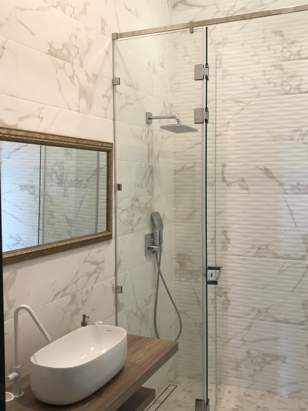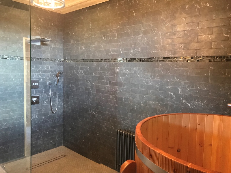 Incontro di stili e materiali differenti nella stanza da bagno al secondo piano con pavimento ricoperto dalla serie Firenze nei colori Nero, Bianco e Grigio – formato 25×21,5 cm. Nella zona doccia si distingue Boston Round Mosaico Blu Petrolio, mentre a parete è stata utilizzata Boston Petrolio 7,5×30 cm insieme alla brillante collezione Lumina White Gloss e struttura Diamante – formato 50×110 cm – impreziosita dal listello Satinato Silver. Per il benessere degli ospiti, uno dei sofisticati ambienti della villa ospita l’accogliente bagno turco con pavimento realizzato in Macromosaico 30×30 cm della collezione Terra, colore Malta. La parete veste, invece, la raffinata serie Roma Grafite che riproduce fedelmente la pietra naturale ed è decorata dal prezioso listello Raku. Romantica è la tinozza in legno che completa la zona wellness.