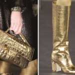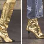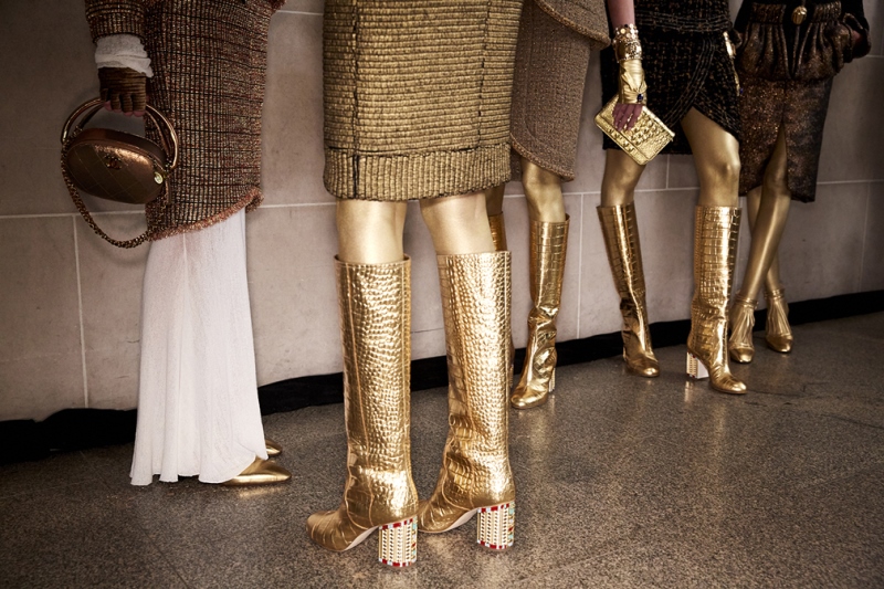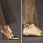 Ruotano attorno al colore oro come principio stilistico stivali, stivaletti, sandali e scarpe della collezione Métiers d’art Parigi-New York 2018/19 di Chanel. Due modelli di stivali e stivaletti sono realizzati in pelle dorata stampata a coccodrillo: questa innovazione creativa consente ogni tipo di audacia stilistica e respira una modernità molto anni ottanta nella forma sobria. La casa di Massaro ha sviluppato quattro modelli in pelle di lamé: due paia di stivali e due sandali, piatti o con un tacco piccolo. Gli stivali coscia esplorano una linea grafica con codici sottili: un ginocchioleggermente arrotondato e un puntale nero – un cenno alla scarpa bicolore tanto cara a Gabrielle Chanel. I loro tacchi gioiello da 10,5 cm, realizzati dalle Case di Desrues e Goossens, presentano forme geometriche in smalto e cabochon multicolori che evocano le pietre dell’antico Egitto. Per quanto riguarda i sandali, adottano audacemente un intreccio di raffinati cinturini dorati attorno al collo del piede e alla caviglia. Gli accessori della collezione Métiers d’art Chanel Paris-New York 2018/19 mettono in risalto il fruttuoso dialogo tra Métiers d’art di Chanel, Karl Lagerfeld e Virginie Viard in modo sorprendente.