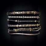 Il risultato della collaborazione è una combinazione di Bijoux e Design che coinvolge anche brand di eccellenza come Edra e Baxter dei quali si utilizzano gli straordinari pellami. Ogni pezzo è unico, il frutto di appassionate lavorazioni esclusive che, come nel pezzo Tutti in uno, uniscono tanti bracciali in un solo oggetto.