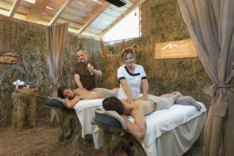 ll’ingresso, una scultura in fieno rappresentante una donna seduta su due covoni evoca il piacevole trattamento che segue una volta entrati nel magico luogo fiabesco. La vista è appagata dall’arredamento interno: il fieno è naturalmente l’elemento principale; i lettini per il massaggio sono coperti di fieno e un albero con le pigne fa da elemento di unione con le sale relax della Mandira Spa, il cui ambiente è in sintonia con il territorio. Entra subito in gioco l’olfatto, inondato dal piacevole profumo che la terapista nebulizza all’interno un piacevole risveglio olfattivo. La conoscenza delle erbe come rimedi naturali hanno permesso alla Mandira SPA di esaltare il contatto con la natura alpina proponendo un trattamento viso e corpo esclusivo: circondati dagli effetti benefici del fieno, tra i profumi, gli infusi e gli olii, il rituale “Badent da Fen” riattiva l’energia interiore per una nuova vitalità. Il trattamento prosegue con l’effetto di speciali campane sui chakra: anche l’udito entra in gioco e viene stimolato da questo benefico suono. Il viso viene deterso e massaggiato con il rituale Mandira, la pelle viene idratata con i prodotti della nuovissima linea Mandira Alpine Care, appositamente studiati per i trattamenti signature della Mandira SPA. La maschera preparata con le erbe dell’Apotheke rigenera i tratti del viso. Il massaggio corpo è eseguito con l’olio Mandira Alpine Care drenante, un toccasana per la schiena e per le gambe: il tatto è coinvolto per tutta la durata del “Badent da Fen”.