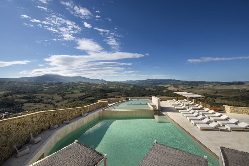 Connubio perfetto tra natura e benessere, la OLISPA: lo spazio dedicato al benessere che si estende su una superficie di 1.500 metri quadrati e in cui ogni angolo è stato concepito per offrire un’esperienza sensoriale immersiva. Il travertino toscano dà vita a un ambiente lineare ed essenziale, in cui diventa ulteriormente piacevole scegliere tra la vasca idromassaggio, i due bagni turchi, le docce emozionali e le cascate di ghiaccio. Una calda vasca circolare è collegata alle piscine esterne, a cui gli ospiti accedono continuando a nuotare avvolti dal caldo abbraccio dell’acqua e nelle quali possono rilassarsi godendosi il silenzioso spettacolo della Val d’Orcia.