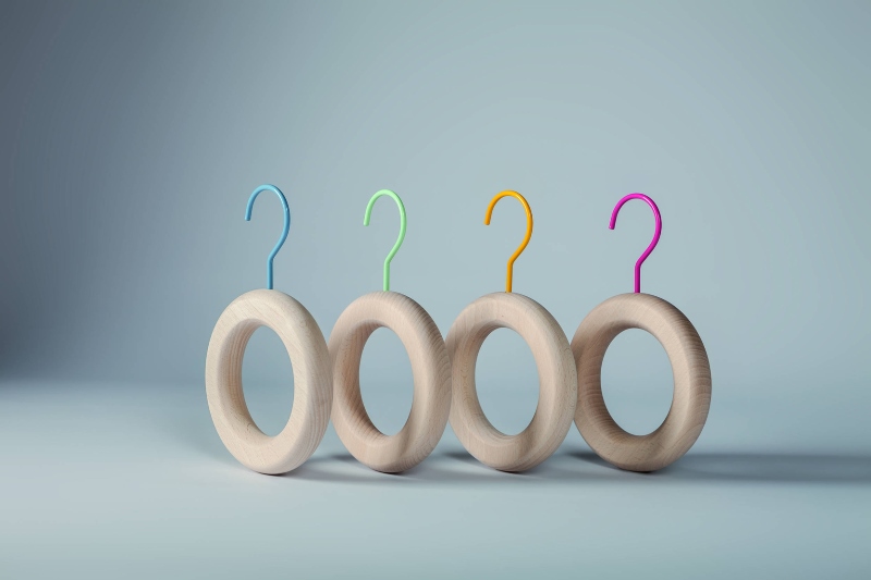 La collezione Confetti comprende il modello Irene, un portabito in legno di faggio non trattato, con gancio e parte inferiore colorati, e A-Nello Big (nella versione non apribile per sciarpe e foulard- foto di apertura), sempre in faggio non trattato con il gancio colorato.