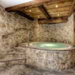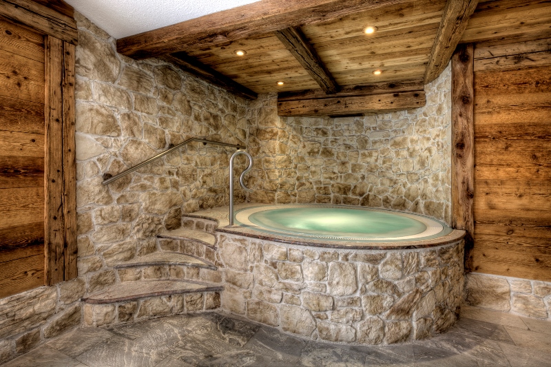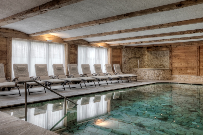 Dopo le prime sciate della stagione, gli ospiti si possono rilassare nella piscina coperta, riscaldata sempre a 30 ° con il pavimento in lastre di marmo e circondata da pannelli e soffitti di stucco e roccia solcati da travature di antico legno massiccio. Oppure, per chi vuole prolungare le atmosfere innevate, può fare un caldo bagno all’esterno, in mezzo alla neve che ricopre il giardino: un idromassaggio coccola gli ospiti che vogliono respirare la frizzante aria alpina. Accanto all’idromassaggio, c’è anche una romantica sauna di legno, caldissima, chiamata “sauna in baita”.
