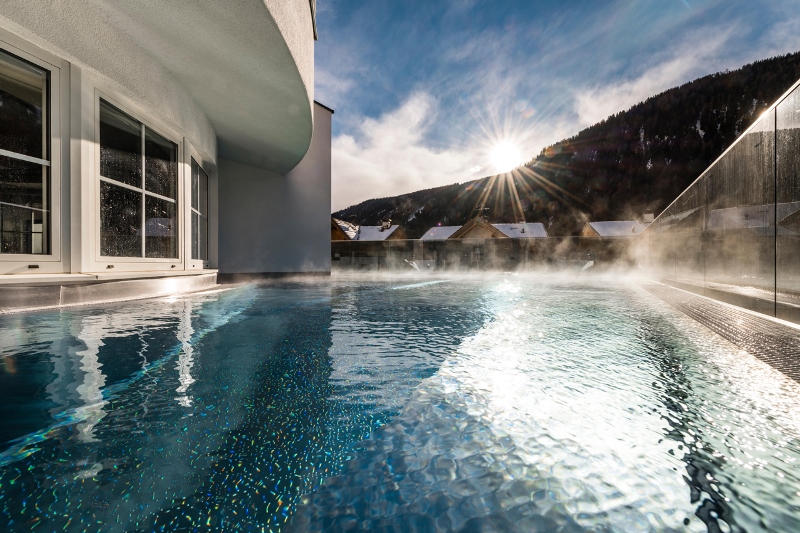 Il relax continua nella piscina esterna dell’hotel: il panorama è incantevole. Di notte, le stelle guardano gli ospiti nuotare nell’acqua tiepida e rilassarsi nell’idromassaggio. All’interno, un’altra piscina permette di nuotare o di lasciarsi coccolare dai getti della vasca whirlpool. Per riscaldarsi dopo una giornata passata sugli sci o sulle ciaspole, nella Spa ci sono diverse saune e bagni turchi: da non perdere la caldissima sauna dove nel tardi pomeriggio vengono effettuate gettate di vapore. In giardino c’è una piccola sauna esterna tutta di legno, intima e caldissima. Uscendo, si può camminare a piedi nudi nella neve e raggiungere la Spa: dopo una tiepida doccia, un’immersione nella calda vasca idromassaggio situata tra le saune è un toccasana. L’Hotel & Spa Falkensteinerhof è anche il punto di riferimento per gli amanti degli sport invernali.