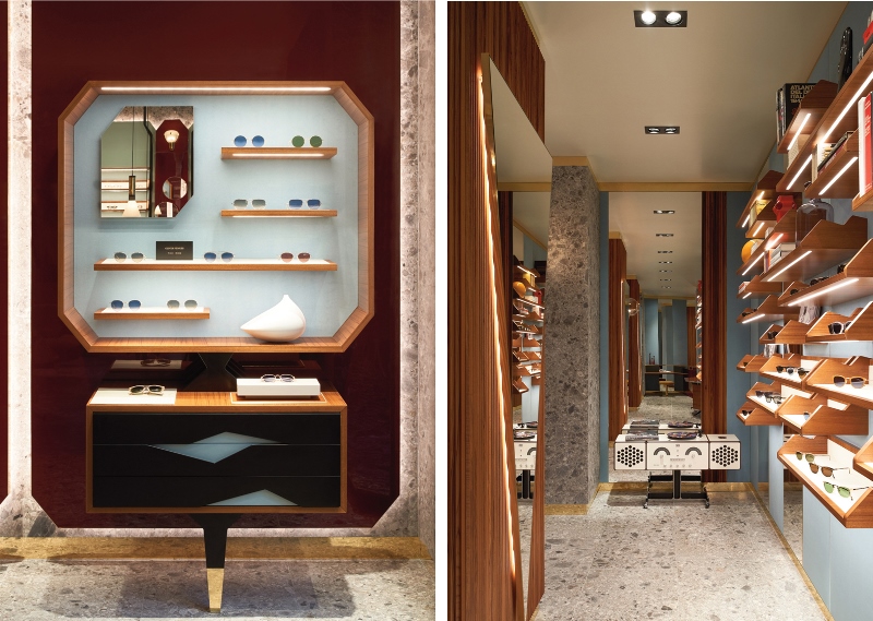 “La boutique di Milano si ricollega alle influenze urbane locali e all’estetica lifestyle di Oliver Peoples. In fase di progettazione mi sono lasciato ispirare dagli appartamenti borghesi meneghini degli anni Cinquanta e Sessanta. A sinistra troviamo il soggiorno, caratterizzato da una zona salotto su misura, mentre a destra la sala da pranzo, con credenze e un lungo tavolo. Sul retro abbiamo lo studio decorato con scaffali a muro, la cassa e i vinili accompagnati da un giradischi progettato dai fratelli Castiglioni. Per onorare la ricca tradizione di Milano, abbiamo chiesto ad artigiani locali di realizzare tutti i mobili, gli espositori e le luci e selezionato alcune lampade vintage da collezione. I materiali usati comprendono degli elementi tipici del design cittadino, come il ceppo di Gré, il marmo Verde Alpi e i particolari in ottone”, ha spiegato Giampiero Tagliaferri, Creative Director di Oliver Peoples.