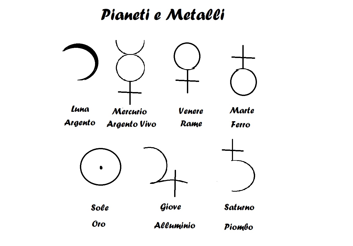 Per gli alchimisti, la luna è sempre stato un oggetto del desiderio. Non solo infatti tutti gli alchimisti erano affascinati dalla sua luce ma erano anche determinati a riprodurre la sostanza di cui la luna stessa era fatta. Questo è uno dei grandi miti legati all’alchimia. Nei tatuaggi geometrici, a differenza degli elementi naturali, luna e sole, che in alchimia erano collegati agli elementi argento e oro, possono essere rappresentati in tantissimi modi differenti. Ecco un piccolo schema dei simboli alchemici per i pianeti e i metalli.