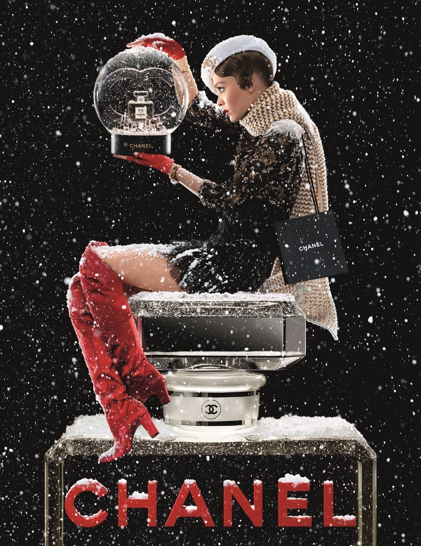 Un abitino corto, mezzi guanti e stivali rossi, acconciatura anni quaranta con un basco bianco: Lily-Rose Depp è incantevole nella sua spensieratezza. Seduta su un gigantesco flacone, la ragazza scruta una grande boule de neige, come una cartomante intenta a leggere il futuro. “Vedo… Vedo…” Tra i pacchetti regalo, scorge il suo numero magico: il numero 5, accompagnato dal suo profumo preferito, N°5 L’EAU.