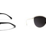Infine, una montatura ovale in metallo dorato o nero opaco circonda lenti grigie o specchiate con riflessi mutevoli. Lo strass risponde ai colori delle cornici e segue le linee delle sopracciglia. Due disegni ottici, rettangolari e quadrati, completano la storia.