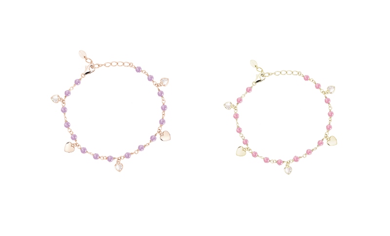 Le collane, lunghe 45 centimetri, i bracciali e gli orecchini sono arricchiti da ciondoli d’argento a forma di cuore, talvolta con zirconi che intervallano e legano l’una all’altra le pietre colorate, esaltandone la compostezza.