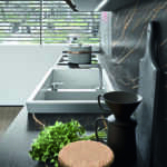 Ne sono un esempio la distribuzione degli elementi nell’ideale spazio dove la cucina viene immaginata – con zona operativa / cottura e zona lavaggio da un lato, parete attrezzata con colonne ed elettrodomestici a incasso dell’altro – e l’equilibrio quasi zen creato dal pregio dei materiali accostato alla linearità dei volumi: il calore del rovere dilavato scelto per le ante si armonizza infatti con la finitura laccato tortora lucido dell’unità a parete, più contemporanea; l’apertura a gola delle ante di colonne e pensili esalta l’essenzialità del design e valorizza le superfici, come quella del grès cava noir desir opaco utilizzato sullo schienale e sul piano di lavoro.
