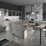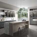 Più elegante e tradizionale la versione di Vita Bella in cui le ante telaio con maniglia sono abbinate a pensili con telaio laccato e vetro fumè. Le nuances del grigio si abbinano armoniosamente alle sfumature del marmo di Carrara scelto per il piano di lavoro e al rovere dust del tavolo snack.