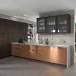 Contemporanea, quasi in stile industriale, la composizione studiata per dare massimo rilievo ai materiali. Un’isola dal design essenziale, sottolineato da ante lisce per le quali è stata realizzata una innovativa finitura laccato metallo liquido rame; un colore originale, che ricrea sull’anta l’effetto della lamiera di metallo, ricalcandone fedelmente tutte le principali caratteristiche.