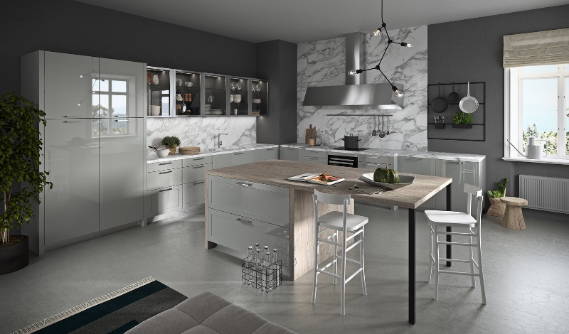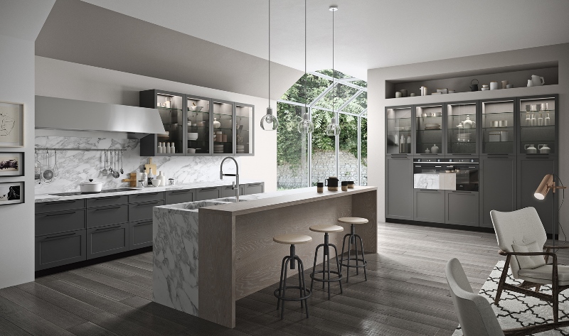 Più elegante e tradizionale la versione di Vita Bella in cui le ante telaio con maniglia sono abbinate a pensili con telaio laccato e vetro fumè. Le nuances del grigio si abbinano armoniosamente alle sfumature del marmo di Carrara scelto per il piano di lavoro e al rovere dust del tavolo snack.