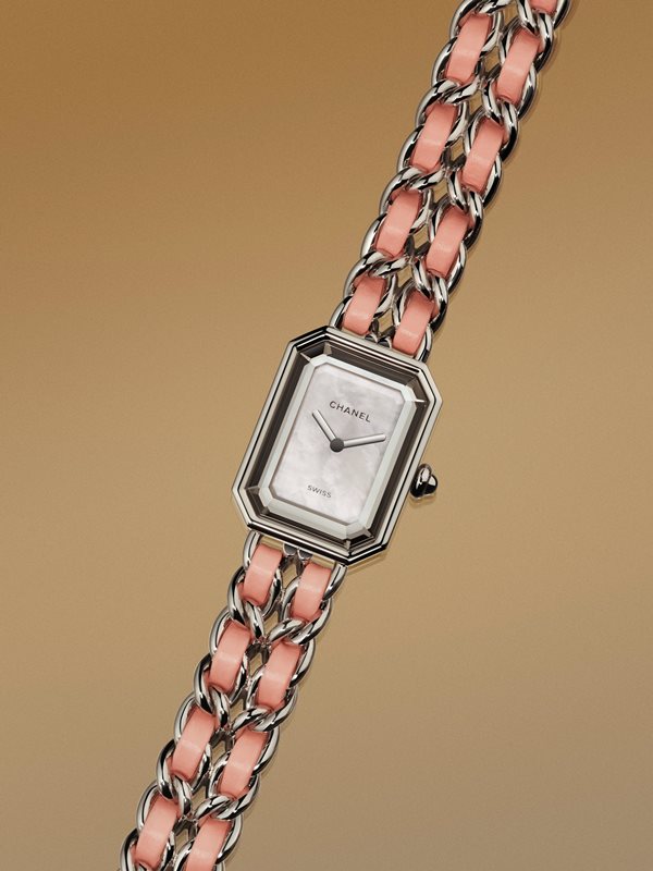 Chanel invita a scoprire le novità come il nuovo orologio Prima Rock Pink Blossom della collezione Première con la catena in acciaio intrecciato di pelle rosa e i nuovi gioielli trasformabili della collezione Camélia.