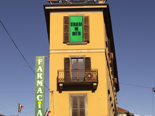 Una delle finestre più in vista in di Porta Venezia, dalla quale, ad ogni tramonto, compare una scritta luminosa destabilizzante destinata a rivelare una disarmante verità, ironica ed enigmatica: “stasera mi butto”.