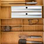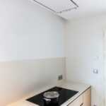L’isola contiene sei cassetti posizionati accanto alla lavastoviglie per agevolare le attività in cucina. Oltre all’isola, la cucina si compone di un’estensione di 4,6 metri di lunghezza che presenta una superficie di lavoro con paraschizzi realizzata con un unico blocco di HI-MACS® Crystal Beige. Le scanalature dello scolapiatti sono incise nel piano di lavoro, mentre i frontali dei cassetti sono realizzati in rovere naturale laccato opaco per conservare l’aspetto originario del legno. Il meticoloso lavoro dei falegnami di Hegenbard ha assicurato che le venature del legno scorressero in modo uniforme per tutta la lunghezza della cucina. Per dare un senso di leggerezza all’ambiente è stato scelto di non installare alcun pensile. Una cappa a soffitto è incorporata in modo molto discreto ed è collegata direttamente al piano cottura.