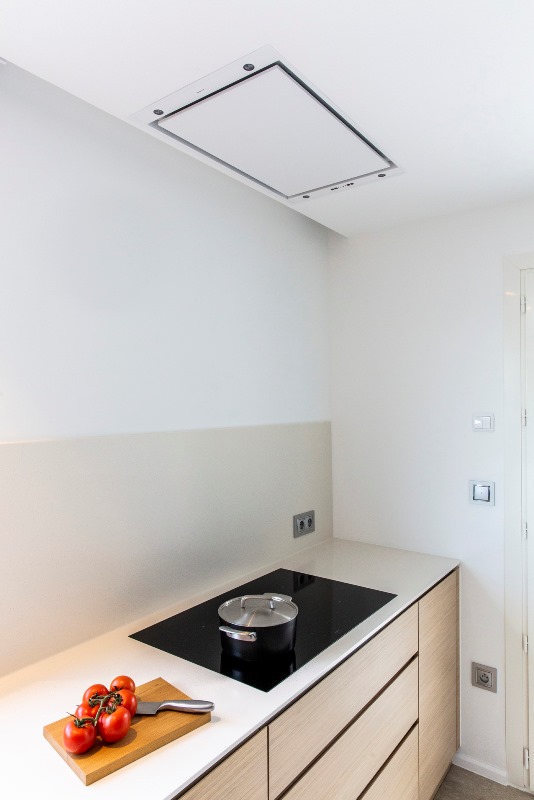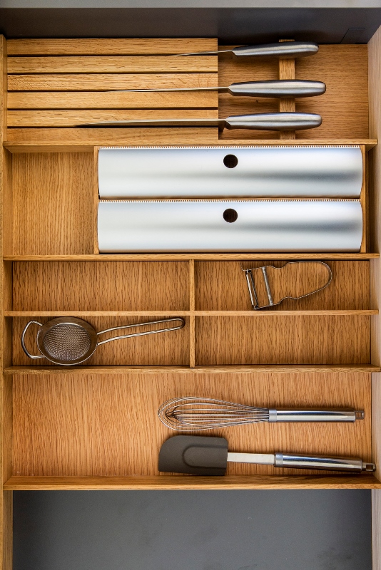 L’isola contiene sei cassetti posizionati accanto alla lavastoviglie per agevolare le attività in cucina. Oltre all’isola, la cucina si compone di un’estensione di 4,6 metri di lunghezza che presenta una superficie di lavoro con paraschizzi realizzata con un unico blocco di HI-MACS® Crystal Beige. Le scanalature dello scolapiatti sono incise nel piano di lavoro, mentre i frontali dei cassetti sono realizzati in rovere naturale laccato opaco per conservare l’aspetto originario del legno. Il meticoloso lavoro dei falegnami di Hegenbard ha assicurato che le venature del legno scorressero in modo uniforme per tutta la lunghezza della cucina. Per dare un senso di leggerezza all’ambiente è stato scelto di non installare alcun pensile. Una cappa a soffitto è incorporata in modo molto discreto ed è collegata direttamente al piano cottura.