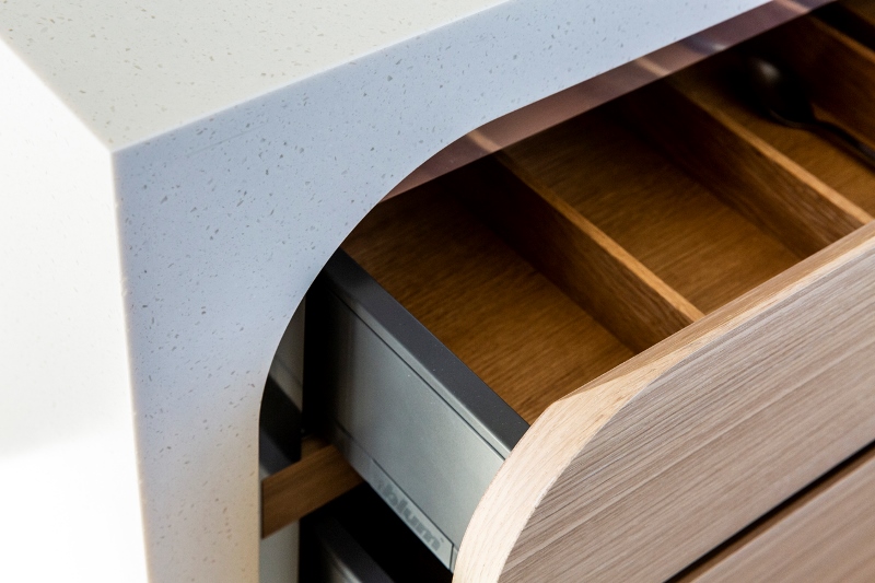 In linea con questa tendenza, le cucine Hegenbart creano zone living, calde e personali che invitano alla convivialità e utilizzano materiali innovativi e sostenibili di ultima generazione. Per questo progetto, Charlotte Raynaud Hegenbart ha immaginato un’isola con lati specchiati che conferiscono leggerezza al top che sembra quasi ‘fluttuare’ nello spazio circostante. Il design arrotondato dell’isola è stato reso possibile grazie all’impiego di HI-MACS® e alla proprietà di termoformatura del Solid Surface che permette di plasmare il materiale nella forma desiderata. Posizionata al centro della stanza, l’isola unisce la cucina alla zona pranzo e al soggiorno, trasformandosi in tavolo da pranzo e in worktop per la preparazione dei pasti.