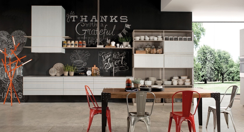Ne è un esempio la composizione in Frassino Hielo che prevede una serie di elementi sospesi. A differenza delle versioni a isola, in questo caso la cucina si sviluppa come unità a parete: una serie di moduli permette di configurare la zona cottura, la zona lavaggio e lo spazio di lavoro a seconda delle necessità, e con altrettanta libertà compositiva è possibile progettare mensole, scaffalature e vani a giorno realizzati con una leggera struttura in metallo. Proprio il metallo diventa elemento protagonista di Beluga: questo materiale, scelto per i tubolari che definiscono la geometria essenziale della cucina, crea un raffinato accostamento con il legno delle ante. Ancora, la lamiera forata dà allo stesso tempo forza e leggerezza alla composizione, creando un interessante gioco di luci e ombre.