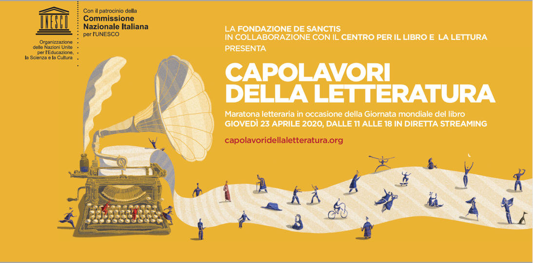 In occasione della Giornata Mondiale del Libro del prossimo 23 aprile, la Fondazione De Sanctis, in collaborazione con il Centro per il libro e la lettura, organizza la sua prima maratona letteraria in streaming. Grazie a una piattaforma creata appositamente per l’occasione e alla partecipazione di grandi autori e attori, la Giornata Mondiale del Libro verrà così festeggiata in tutte le case attraverso la piattaforma capolavoridellaletteratura.org, sul sito di Repubblica, della Corte dei Conti e di TIM.