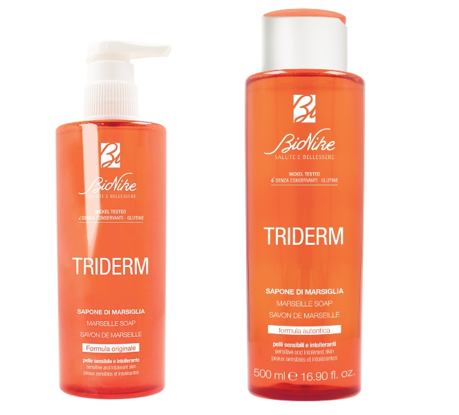 TRIDERM Sapone di Marsiglia di BioNike, realizzato in forma liquida, possiede tutte le virtù e le proprietà benefiche dell’antica e semplice tradizione del sapone di Marsiglia. A base di soli oli vegetali saponificati, deterge in modo equilibrato e con estrema delicatezza anche la pelle più sensibile. Ideale per lavaggi frequenti, protegge il film idrolipico cutaneo evitando la sensazione di secchezza e screpolature. Disponibile nelle confezioni da 250 e 500 ml.