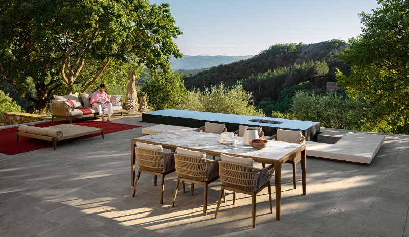 Struttura in teak e alluminio, corde intrecciate e rivestimenti d’ultima generazione, il brand italiano scommette sulle sinergie tra materiali.