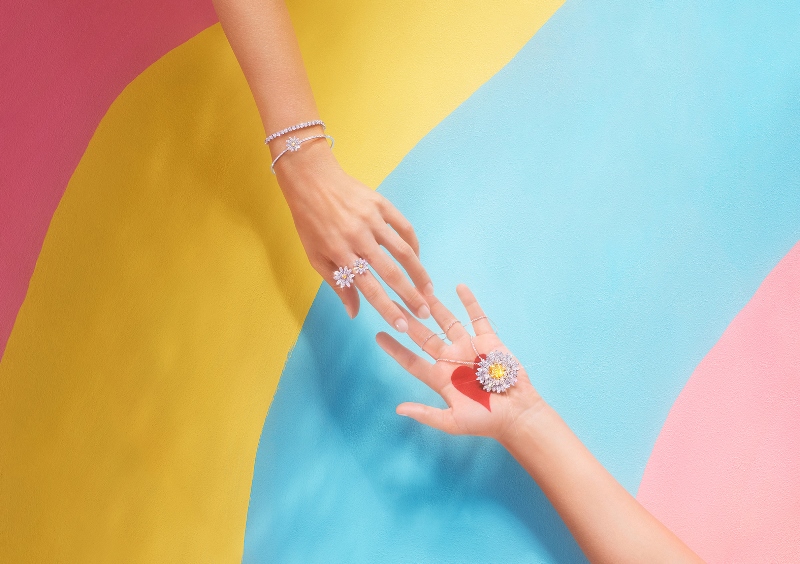 La margherita è la regina della Collezione, ispirata alla bellezza e all’energia della natura e animata con una fresca e moderna rivisitazione, giocando con il movimento dei petali. Brillanti decorazioni Swarovski danno vita a questi simboli, mentre la sofisticata palette con le sue soffuse note di colore rende trendy la Collezione e raffinati anche gli outfit più semplici.