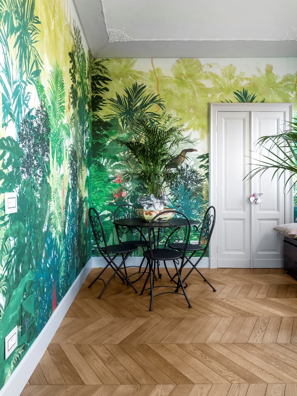 In particolare, l’ultima stanza dell’appartamento, nata con la vocazione di essere, allo stesso tempo, un ambiente indoor e outdoor, con una splendida vista sulla pianura e sulle Alpi, rivela la capacità di una carta da parati di reinterpretare uno spazio: la WallPepper® dal mood tropicale ha trasformato, infatti, questo ‘giardino d’inverno’ in un luogo straordinario, esotico, emozionante, che permette di vivere sensazioni di pieno contatto con la natura, comodamente seduti sul divano o al tavolo da pranzo.
