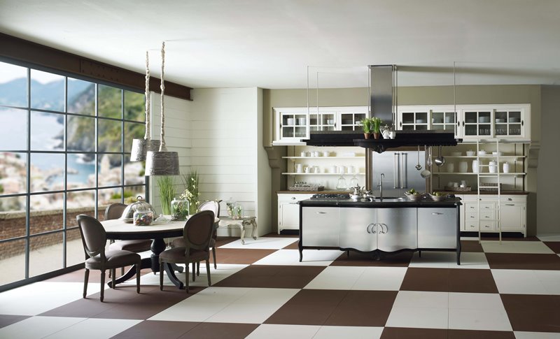Questa cucina è caratterizzata da un’isola centrale che ospita la zona fuochi e dall’imponente vetrina con vetri all’inglese che richiama l’epoca vittoriana. In questo modello convivono stili diversi, sospesi tra passato e presente e al tempo stesso proiettati verso il futuro per un piacere di vivere la cucina made in Italy intesa come cuore pulsante della casa, dove riscoprire giorno dopo giorno il vero sapore della vita.